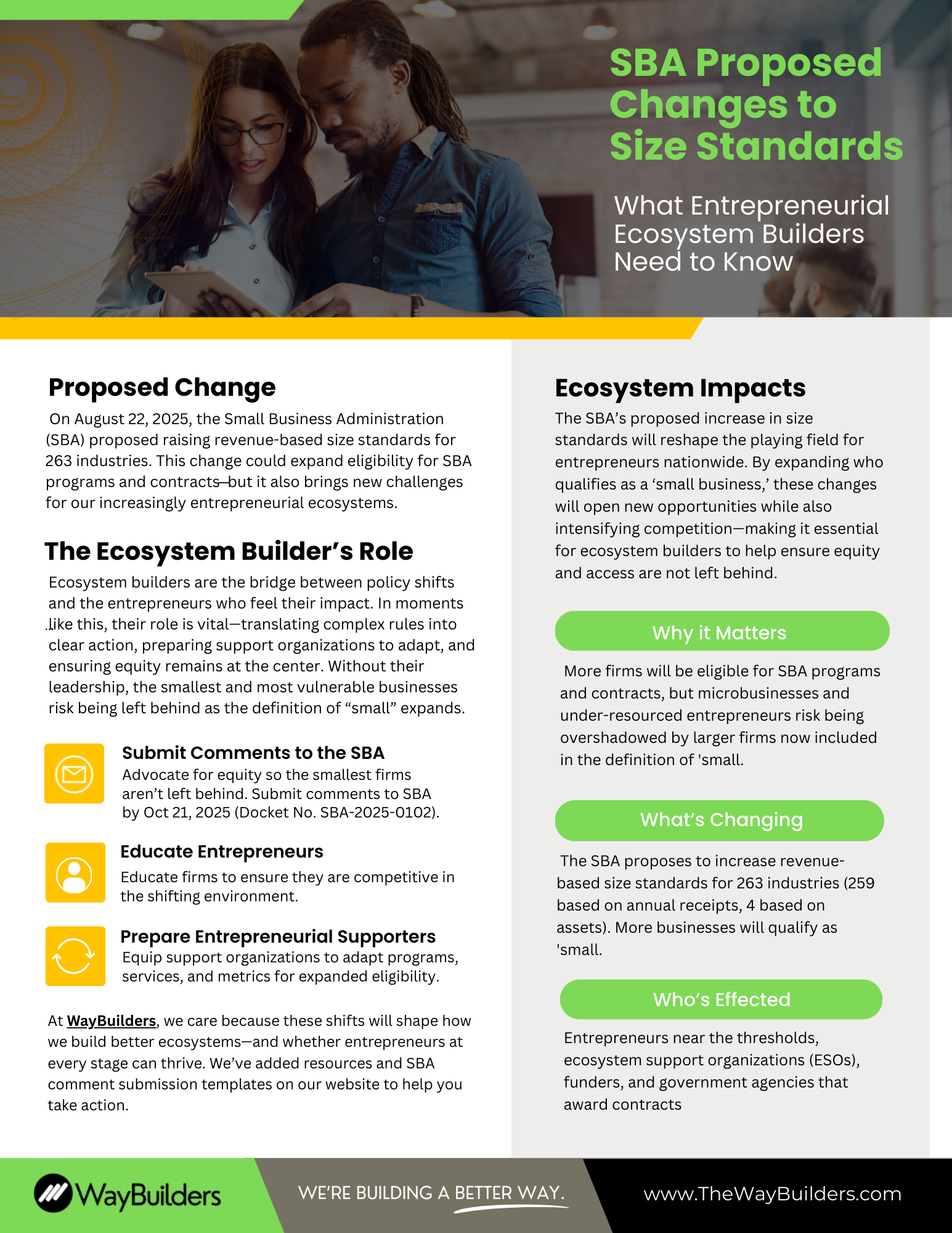 Advocate with SBA → Submit comments by October 21, 2025 (Docket No. SBA-2025-0102) to ensure community voices are heard.
